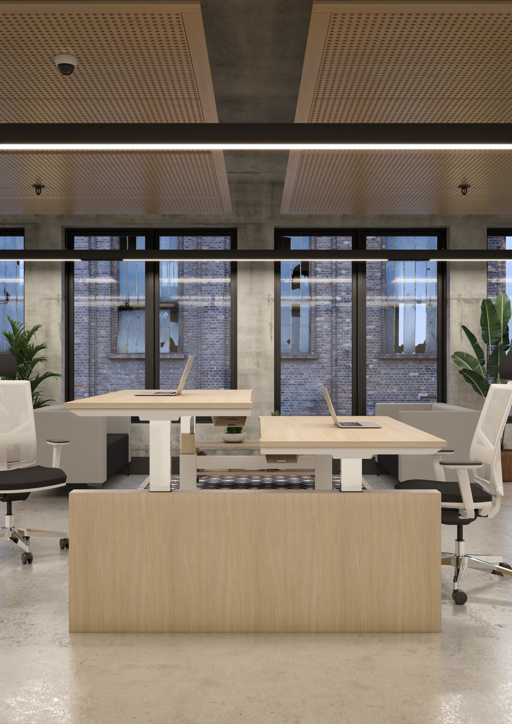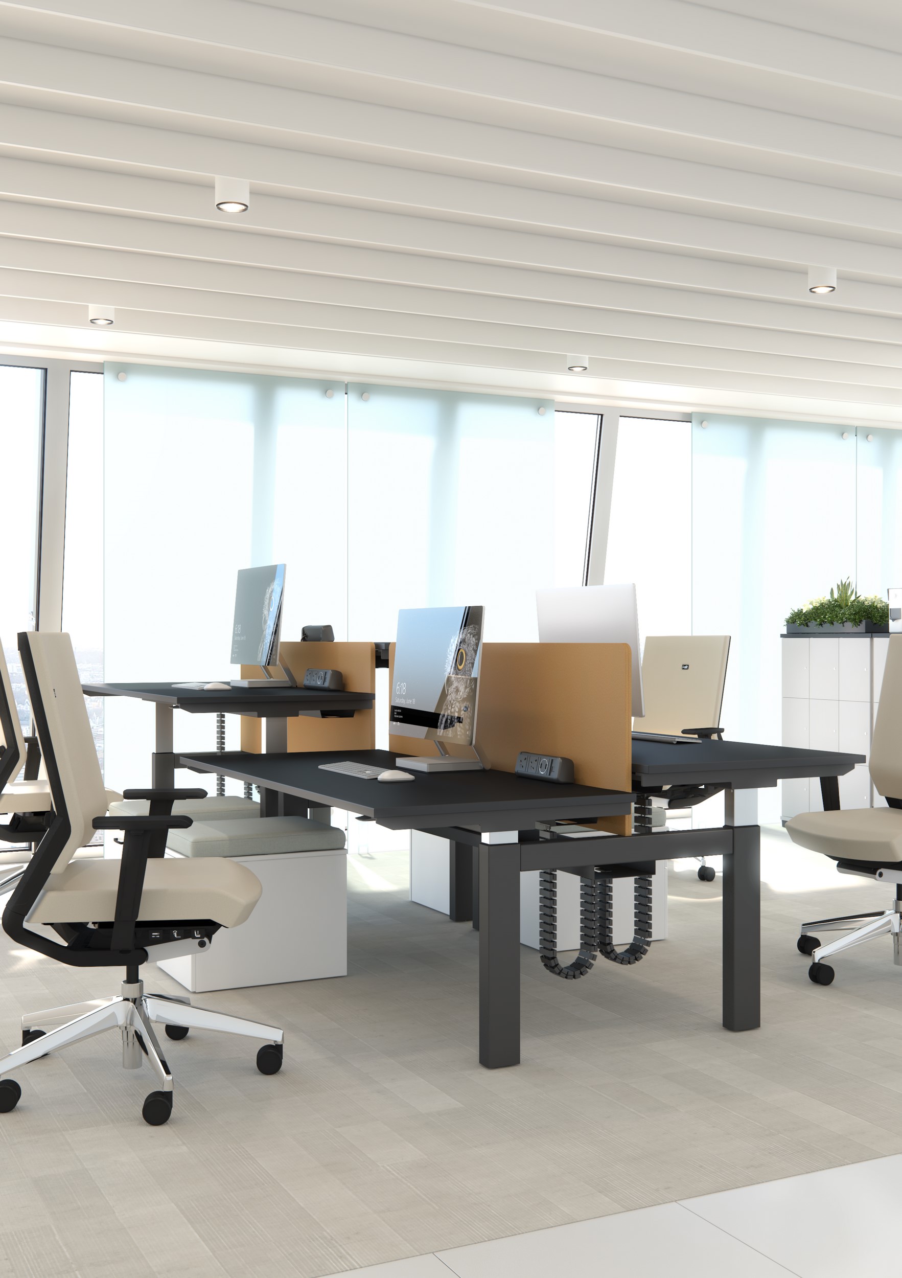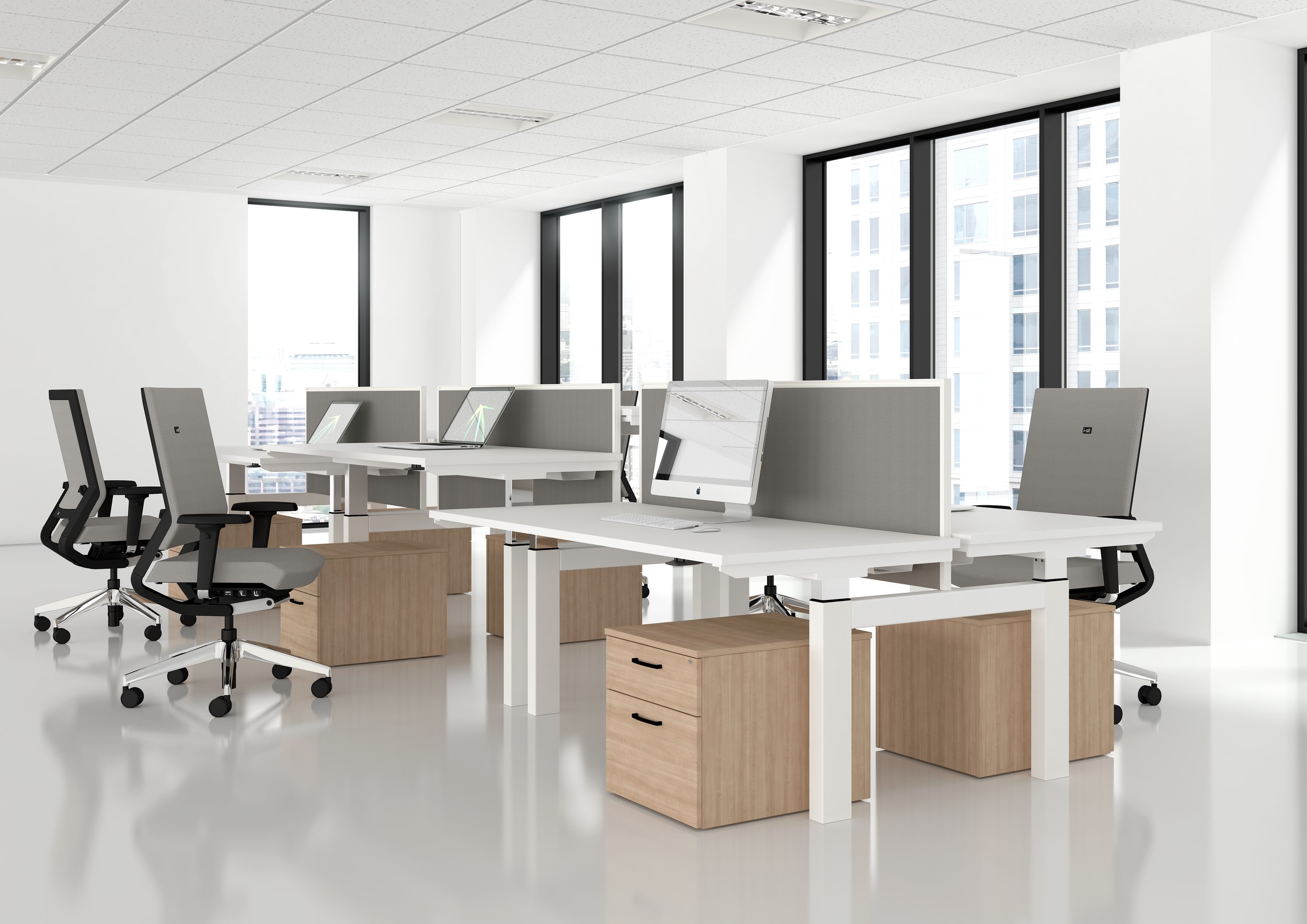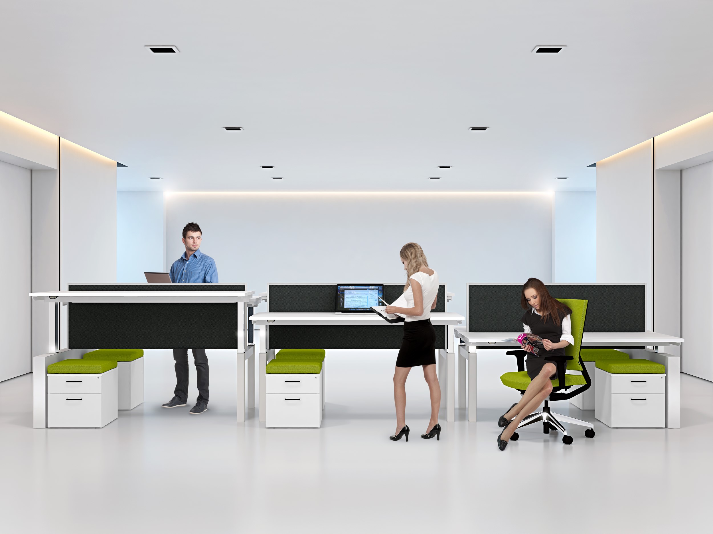 All components are fully interchangeable for maximum flexibility. The sit-stand aspect brings significant health benefits encouraging wellbeing within the office environment. Height adjustable workstations offer height variation from 685mm to 1185mm. Double benches are supplied with sliding tops as standard, enhancing the flexibility of the desking system.
